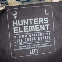 Hunters Element Venom Gaiters do not offer any guarantee of protecting the wearer| they should be worn only as an aid in resisting snake bites. Additionally| it should be noted that this product does not cover all the users vulnerable body parts. We recommend that the user wear thick leather boots and heavy duty trousers to help reduce the risk.