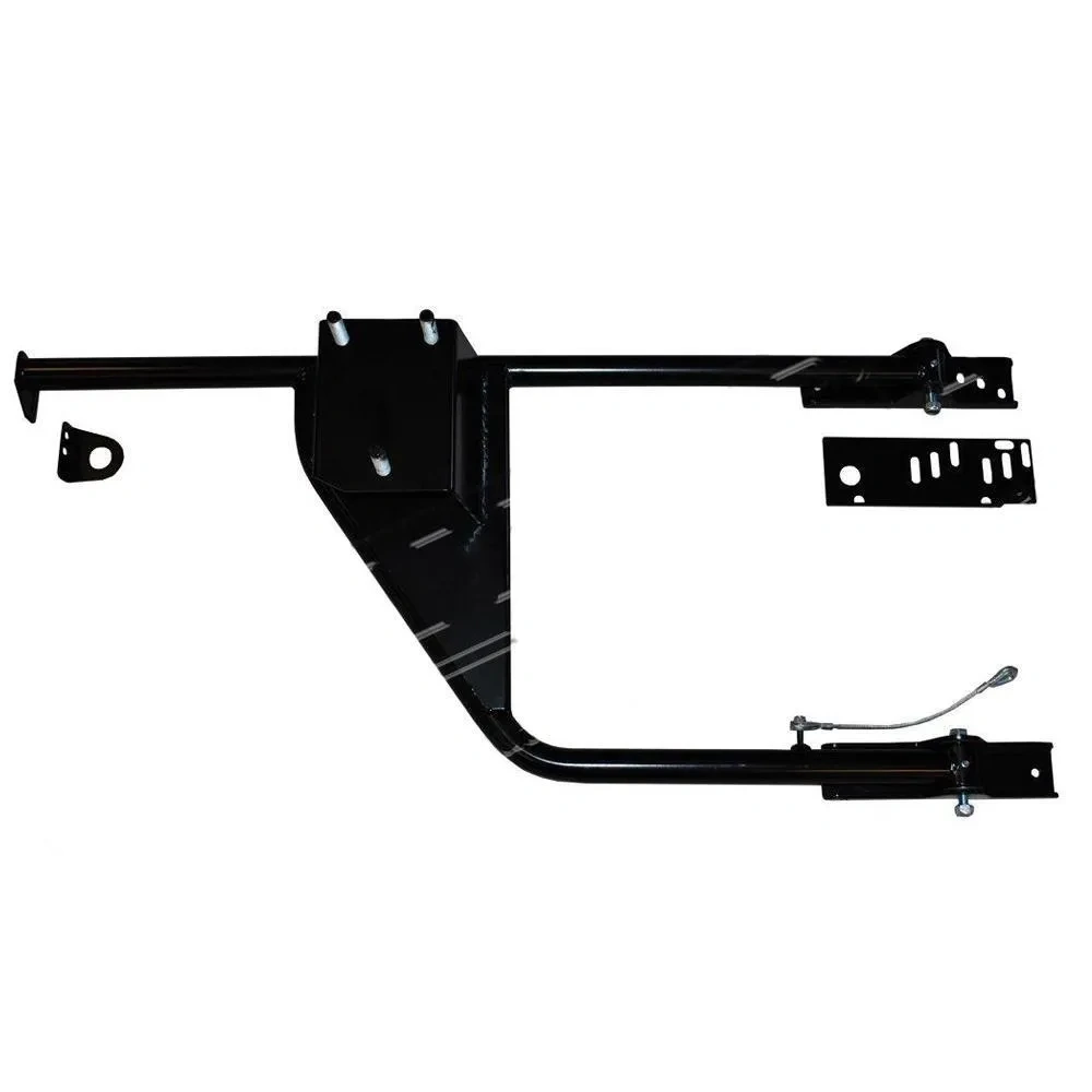 To solve the problem| this tough tubular swing away carrier is fitted with a loop to share the latch on the drop-down tailgate. This secures to the top of the rear tub and to the body mounts on the rear crossmember| to move the weight of the spare wheel to the chassis. This carrier also has a cable stay to stop the carrier swinging open too far| which could otherwise damage the lights and rear panel. This bolts to the panel below the height of the capping| so you can fit it to canvas topped Land Rovers.